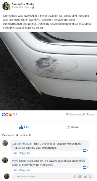 Very happy with the service. I submitted my details online and got a call back within 10 minutes. Ended up saving almost R450 a month on my car cover!